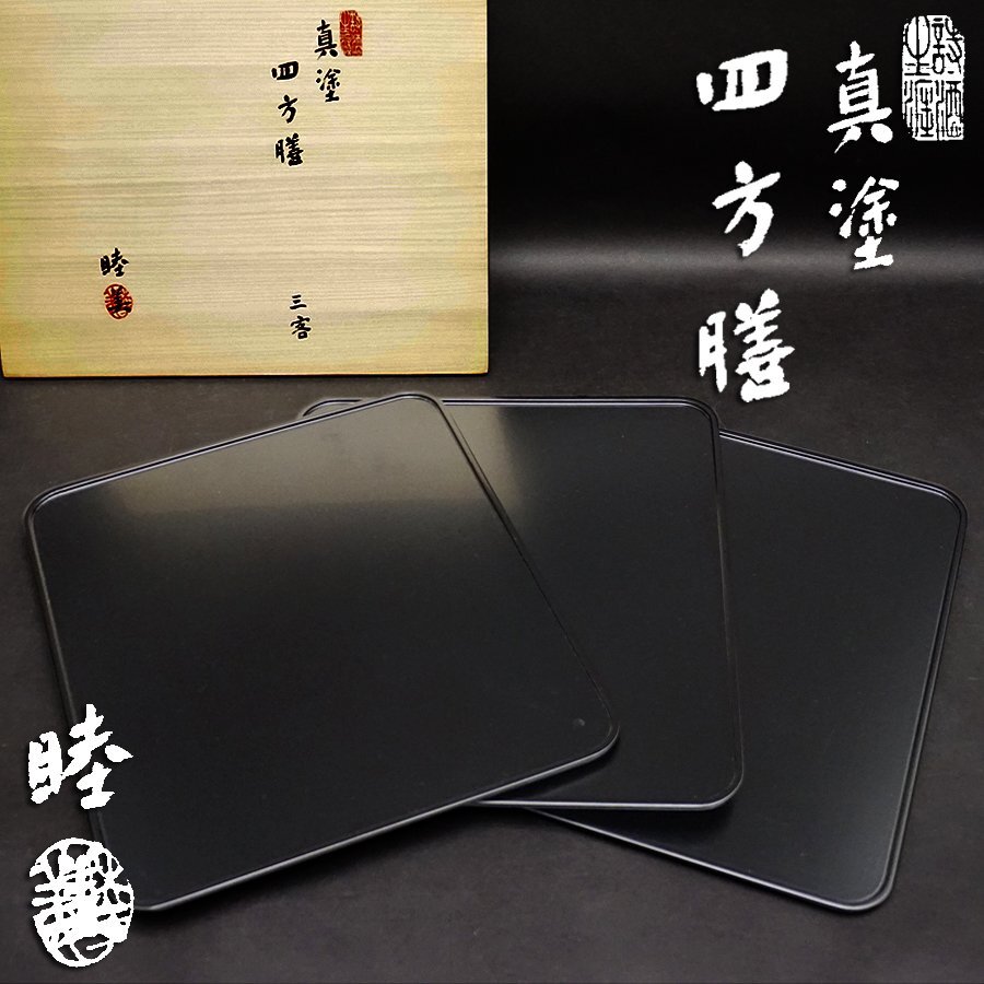 - 鈴木睦美 現代京都漆芸家 裏千家 懐石道具 四方膳 真塗 三客 漆芸 漆器 共箱 未使用品 長期保管品 極美品 保証品 古美術品