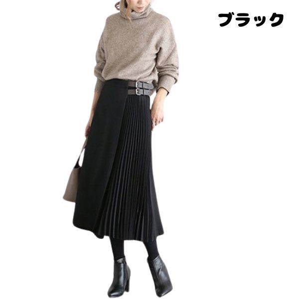 > バックルベルト サイドプリーツ ブラック Lサイズ 巻きスカート きれいめ ロング プリーツスカート 切り替え ミモレ丈 着痩せ ボトムス