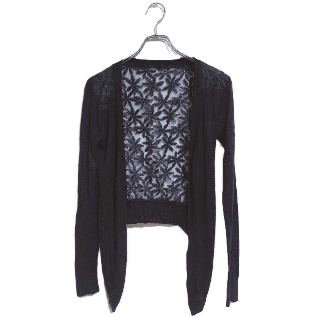 - カーディガン 黒 薄手 M 長袖 花柄 レース切替 春夏 薄手 冷房対策 上品