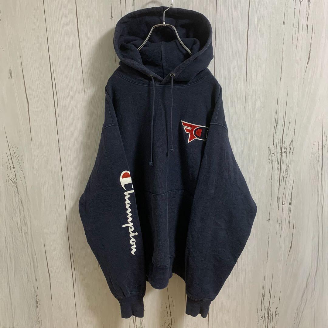 - Champion チャンピオン リバースウィーブ プルオーバーパーカー スウェット トレーナー スリーブロゴ 企業刺繍 紺 ネイビー