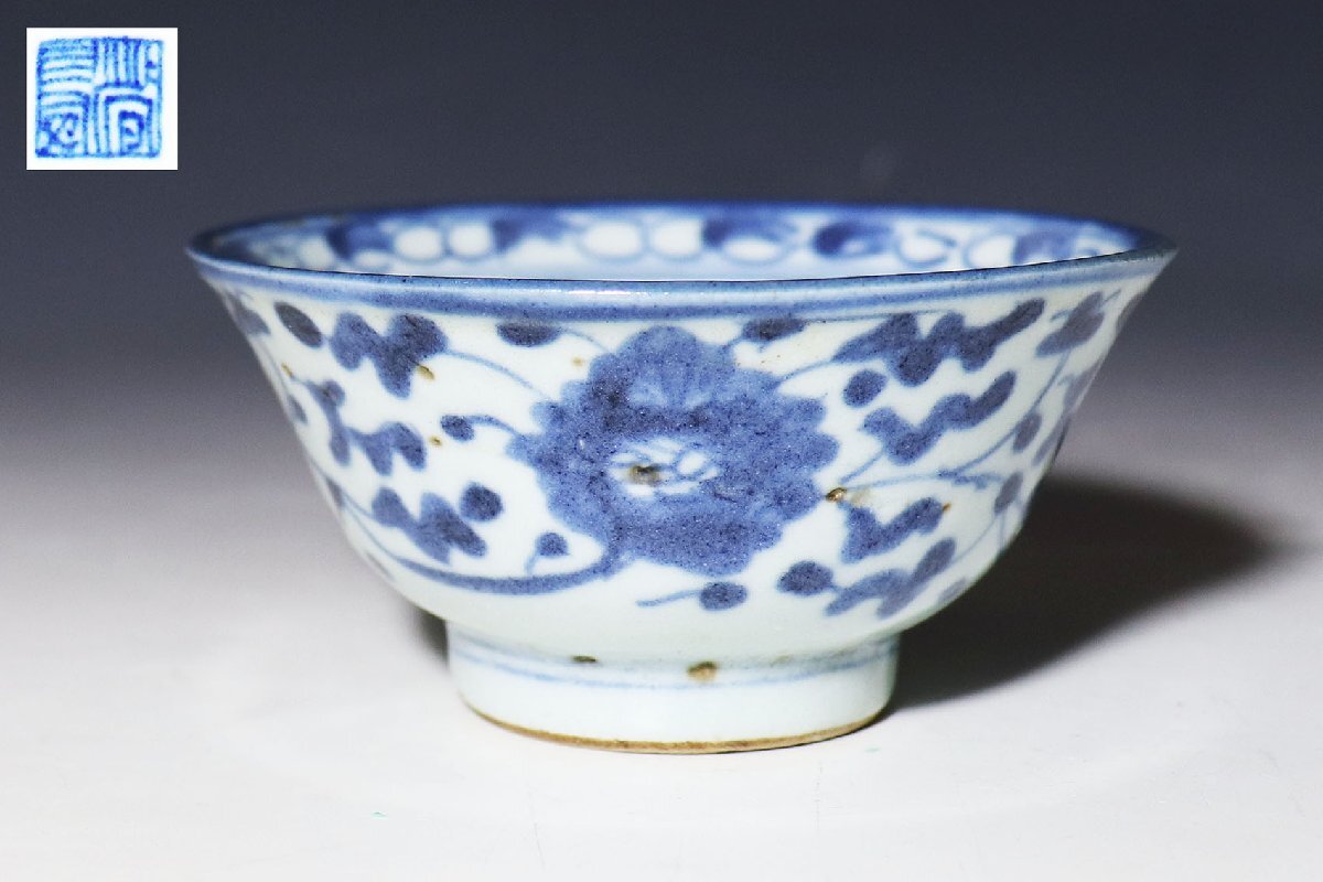 - 【桃】酒器ぐい呑み:清朝期染付花唐草紋様猪口 其の四