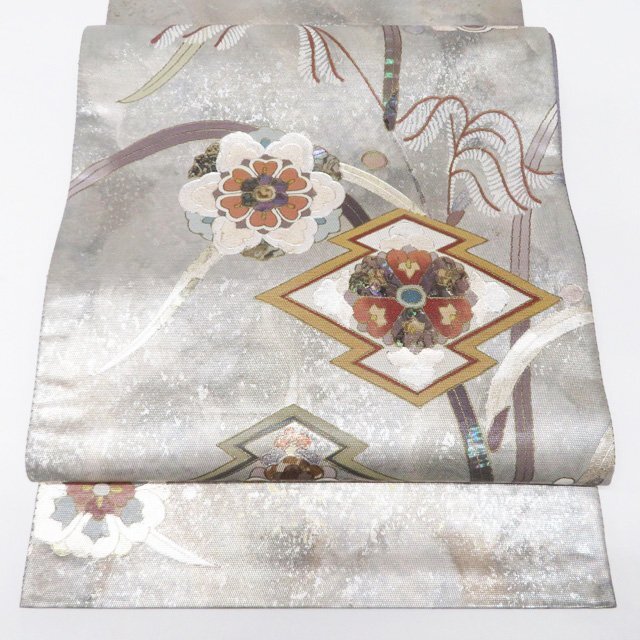 > ★きもの北條★ 螺鈿箔 引箔 作家物 落款 松皮菱 華文 花紋 三通 仕立て上がり 中古 正絹 袋帯 T804-15