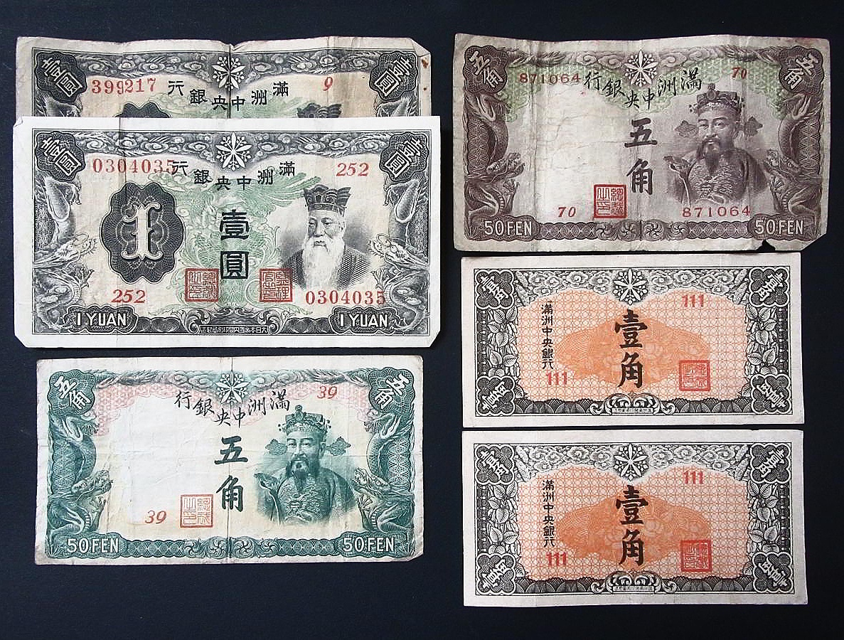 - 1円~ 外国紙幣 満洲中央銀行 乙号券1円 乙号券5角 丙号券5角 丙号券1角 合計6枚まとめ
