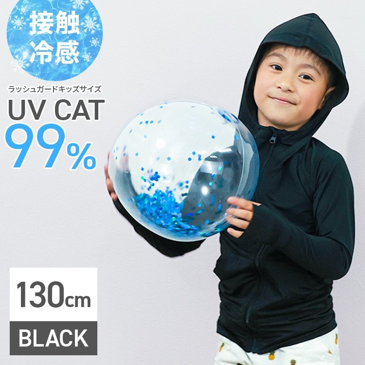 - [在庫処分SALE] ラッシュガード キッズ 子供 パーカー フード付き 接触冷感 男の子 女の子 水着 UVカット 吸水 速乾 日焼け対策 130cm 黒