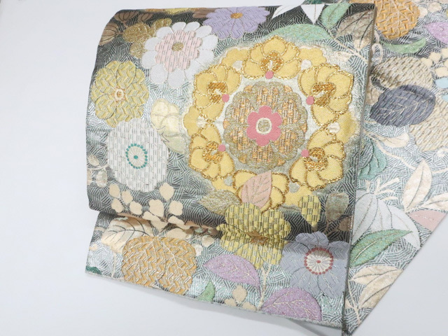 > 《京都一輝堂》リサイクル着物 袋帯 六通柄 花 金糸 正絹 25b09-1739