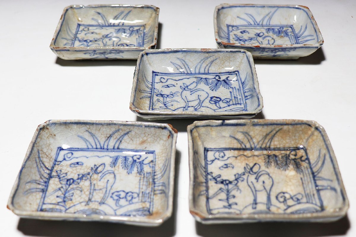 - 【桃】三田呉須染付鹿の図四方小皿 五客