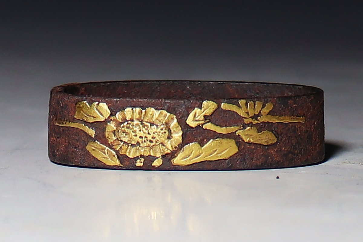 - 【桃】刀装具:金工鉄地金象嵌牡丹花図縁