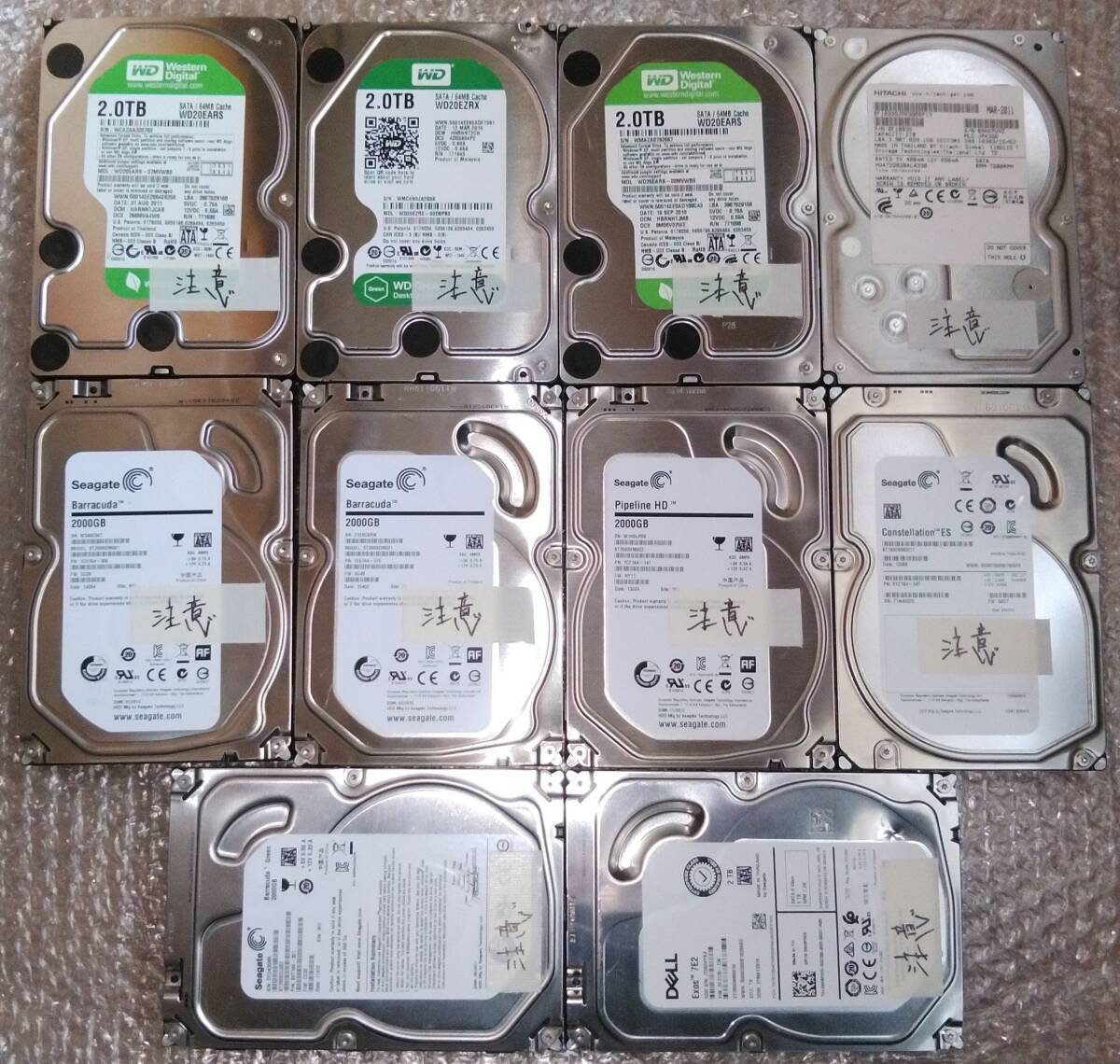 > WesternDigital Seagate HITACHI DELL 2TB SATA 10機セット 注意表示