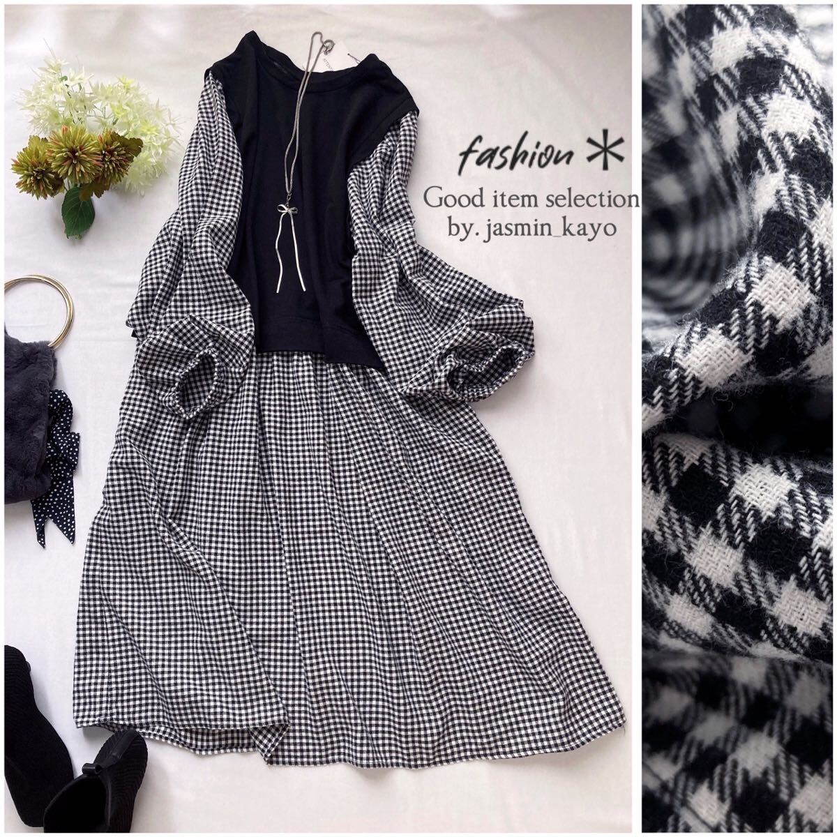 > ◆新品3L~LL◆起毛感ギンガムチェック柄ネル布帛×ミニ裏毛カットソーレイヤードロングワンピ*袖口ゴムINバルーン袖*黒×オフホワイト