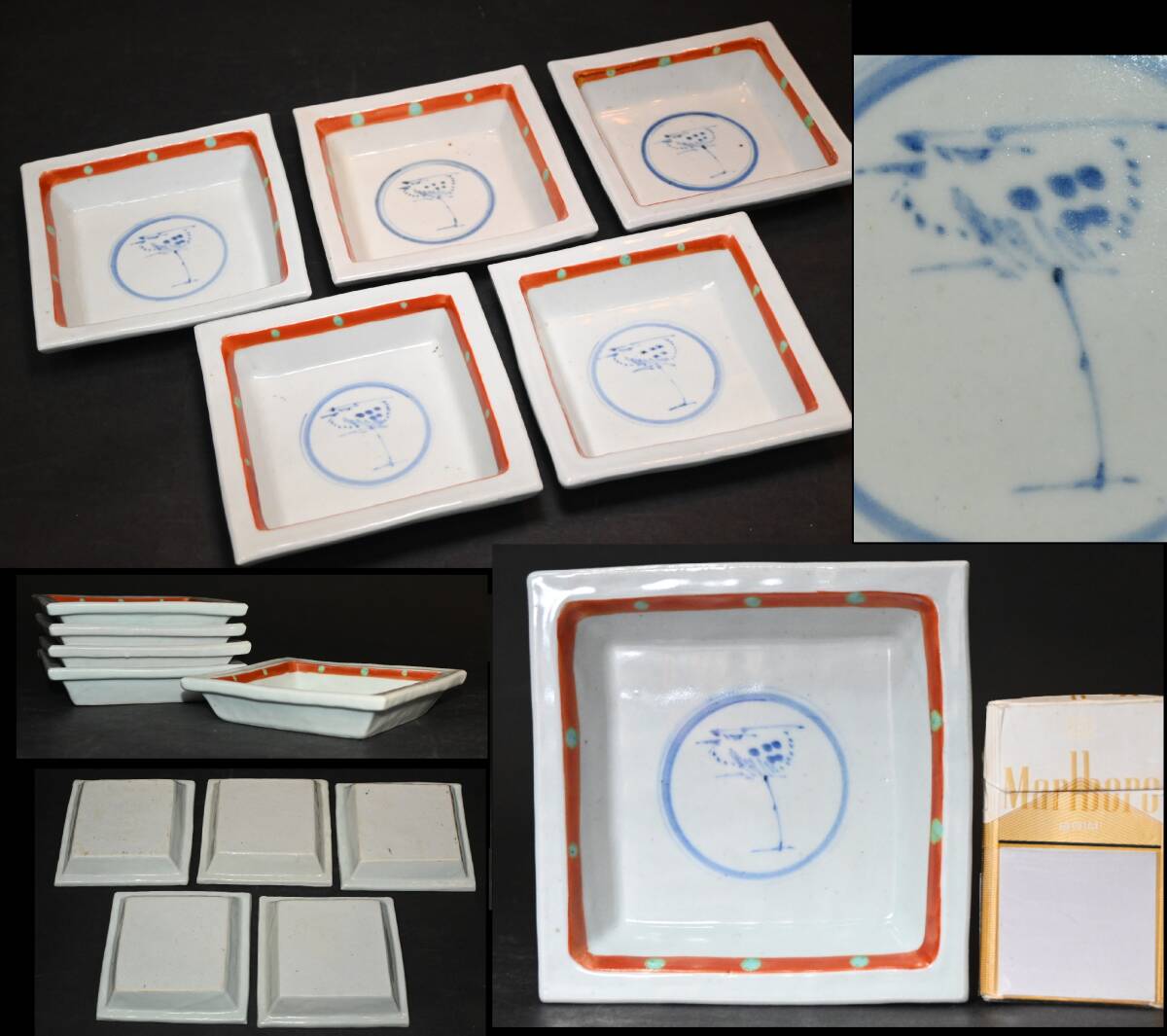 > 真贋保証■瀧田項一 作■ 赤絵 窓絵鷺文 角皿 五客 箱無 富本憲吉/濱田庄司に師事 栃木県那須烏山市生 福島県会津 茶道具 四方皿 銘々皿