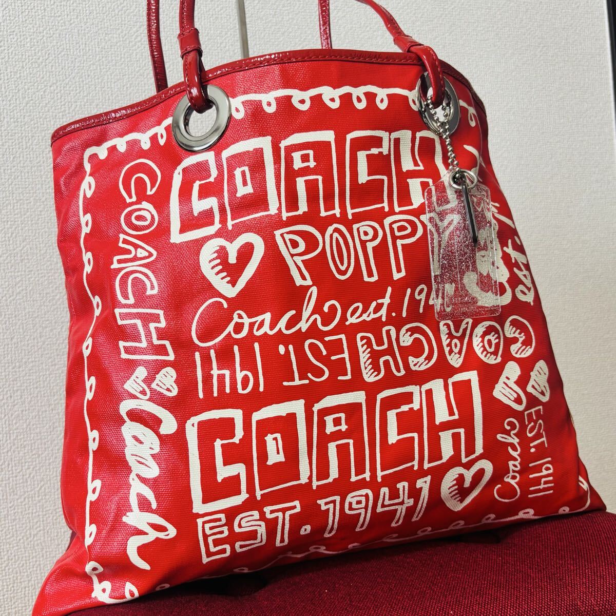 - 1円〜 COACH コーチ トートバッグ ハンドバッグ POPPY ポピー レッド 赤色 PVC 13857 Y2K
