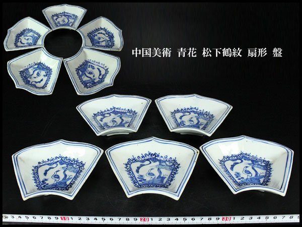 > 【金閣】中国美術 青花 松下鶴紋 扇形 盤 13.5cmx11cm 五件 旧家蔵出 送料無料(F45)