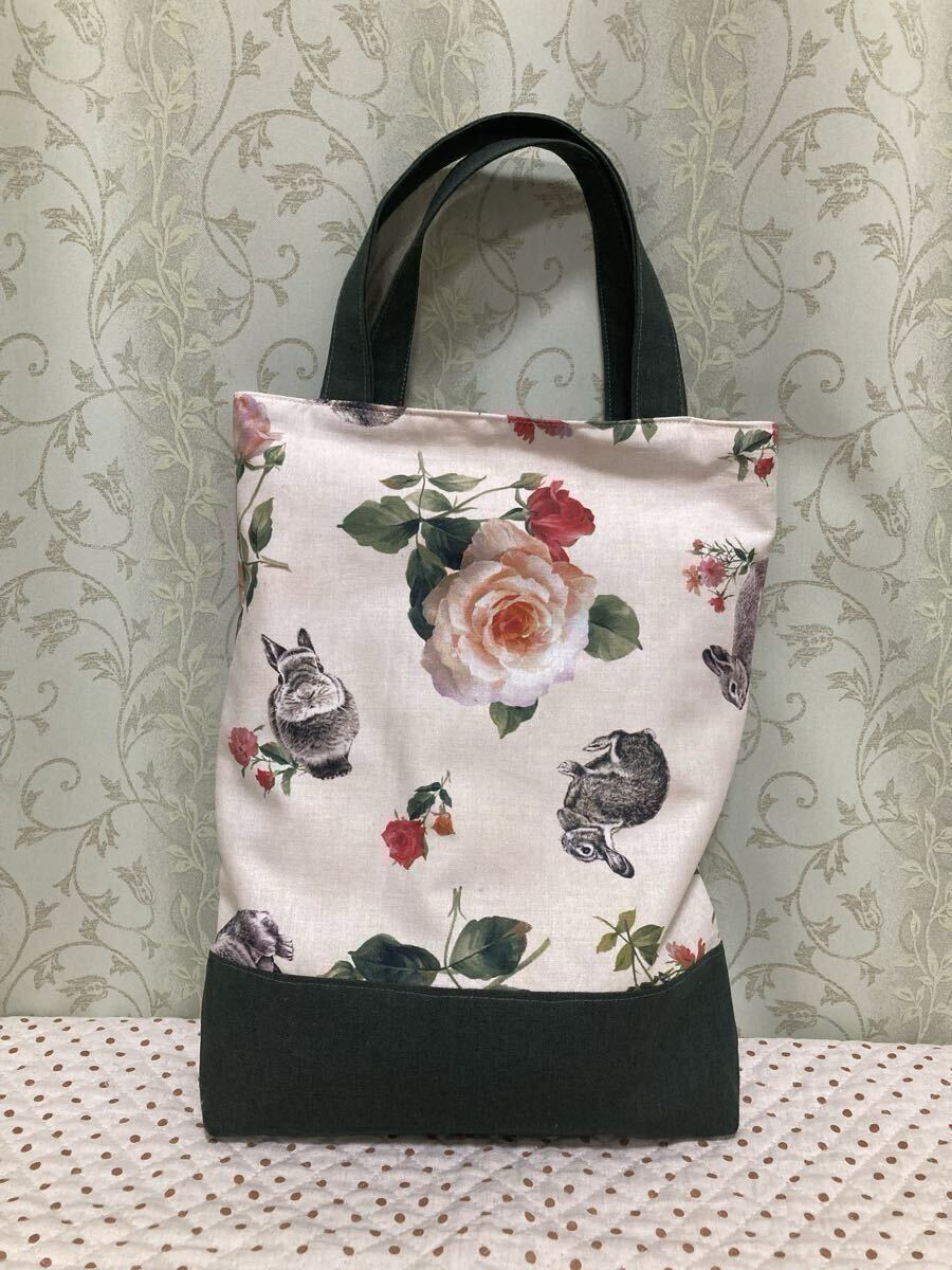 - トートバッグ 縦長 くたくた ぺたんこトート マチあり 切り替えあり ハンドメイド バラ うさぎ A4ファイル入ります