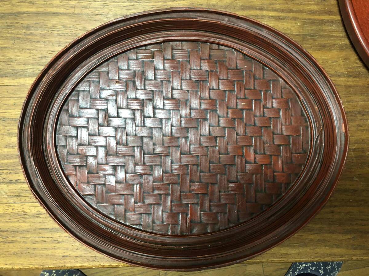 - 籐/竹細工 塗盆 レトロ トレイ 和風 大型 楕円形 竹編み 漆塗り 盆 網代編み 長手盆 横41cm 菓子盆/配膳盆