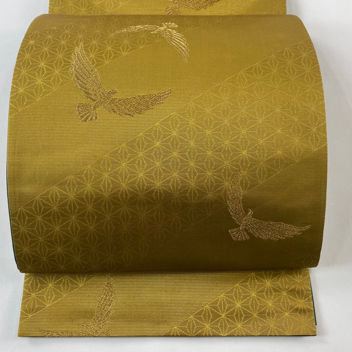 - 【美品】 袋帯 秀品 斉藤三才 落款 鳥 麻の葉 金糸 箔 黄土色 六通 正絹 【中古】