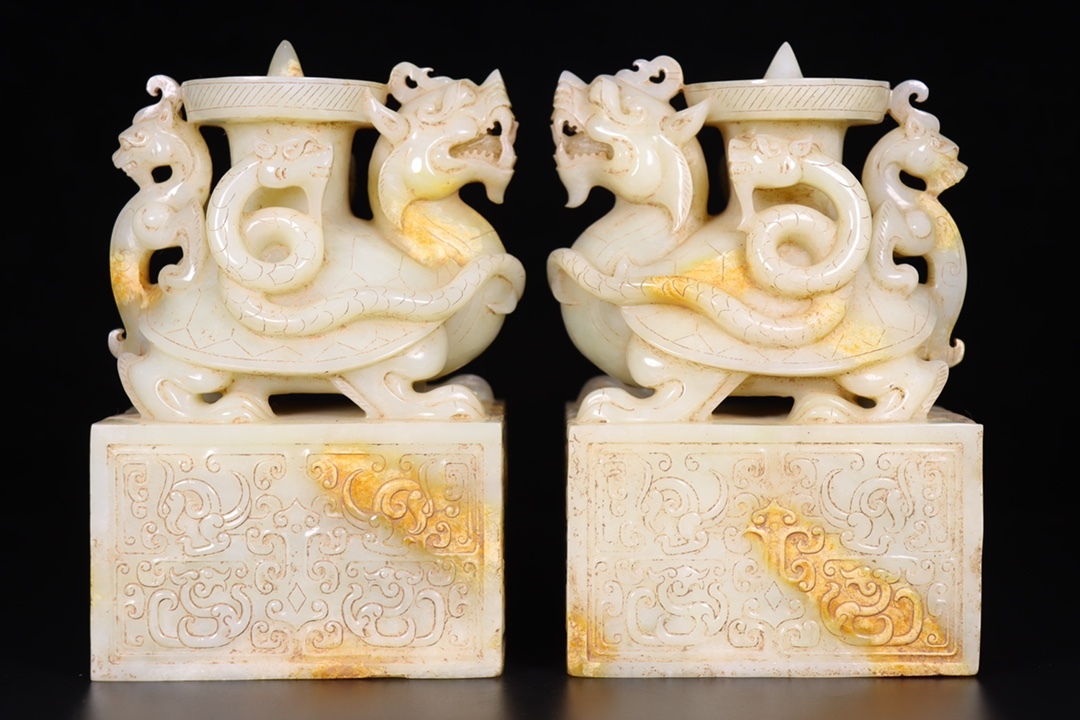 - ▽鴻▽漢朝時代 高古玉 和田玉彫 玄武鈕印章一対 時代物 中国古美術 骨董品