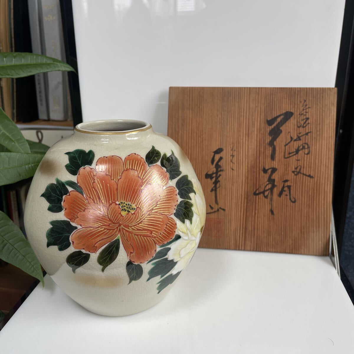 - 未展示 桐箱入り 昭和 レトロ 九谷 華山 壺 花瓶 花器 陶芸 陶器 置物 飾り 和 日本製 オブジェ ヴィンテージ 花柄 牡丹
