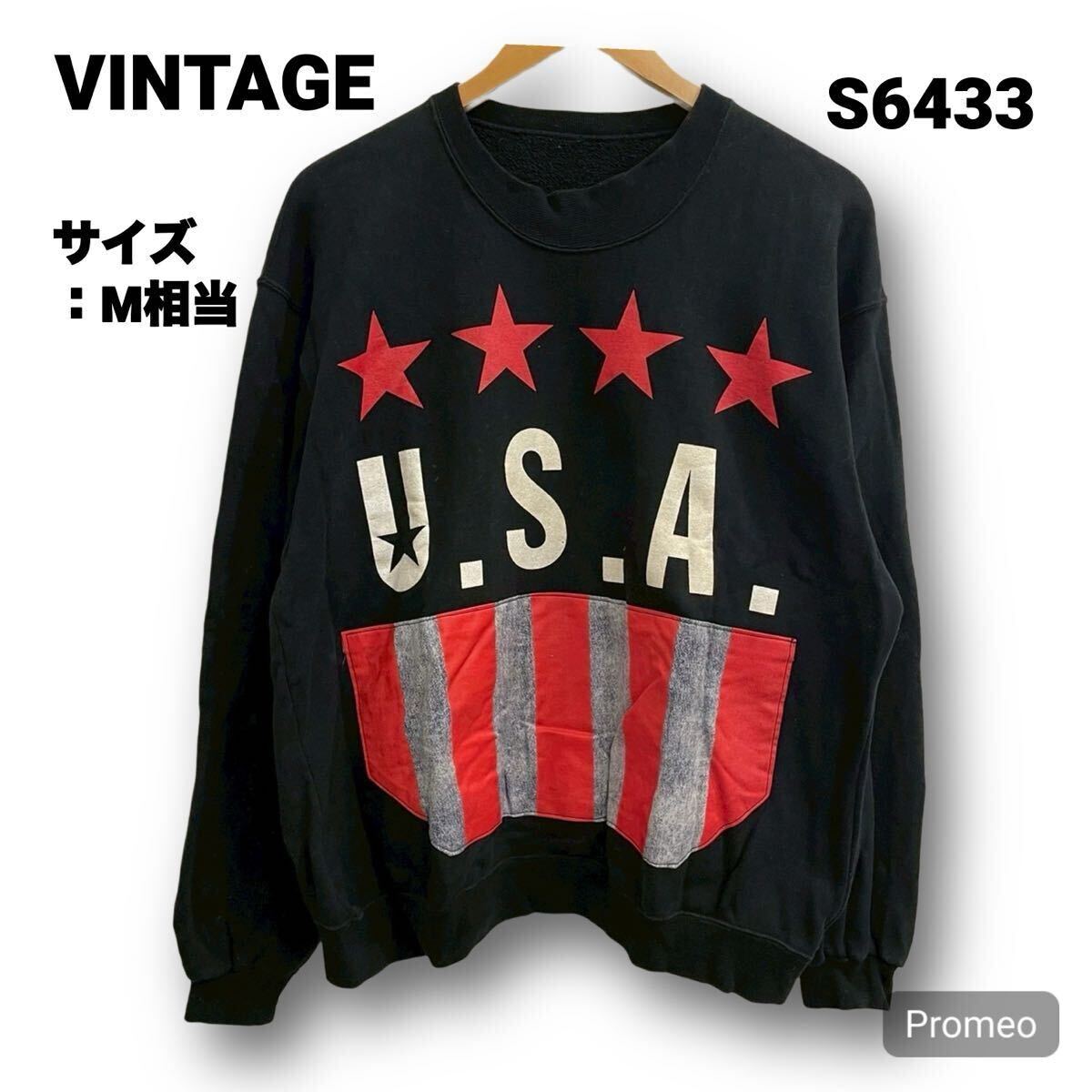 > 【S6433】 VINTAGE ヴィンテージ スウェット トレーナー サイズM相当 ブラック 黒 フロントデザイン フロントプリント メンズ トップス