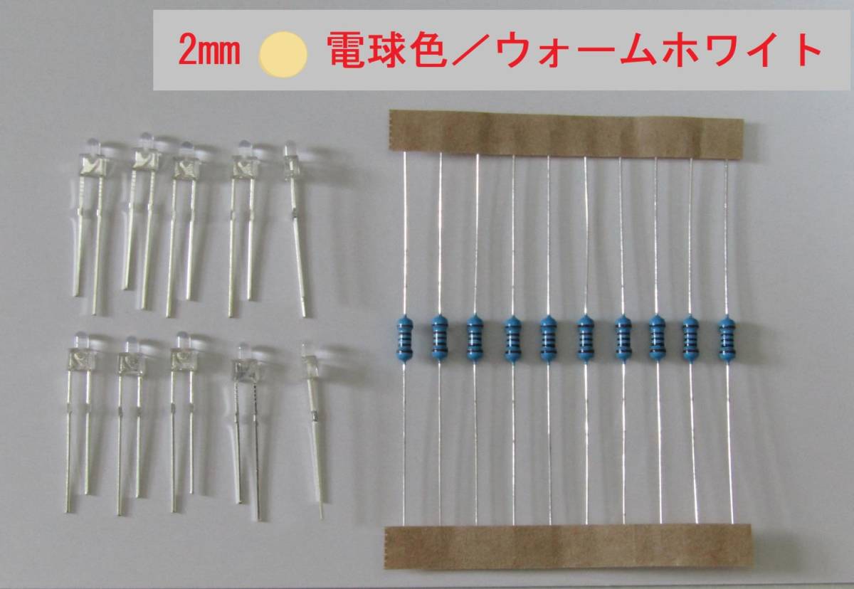 - 2Φ(2mm)LED 発色/ウォームホワイト(電球色) 抵抗付属(12V仕様)/10セット ジオラマ/鉄道模型/プラモデル等の照明