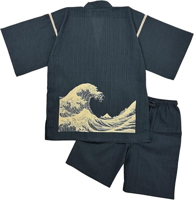 - [江戸てん] 3L 訳あり甚平 しじら織り 涼しい 綿100% 抜染 北斎 腰に波 紺