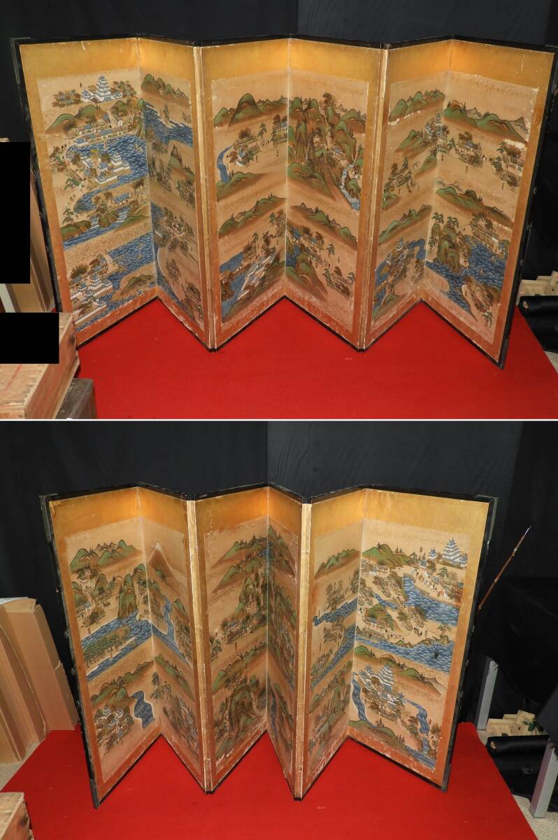 - 作者不明 屏風 六曲一双 城下町風景画 古画 日本画 古美術 骨董品