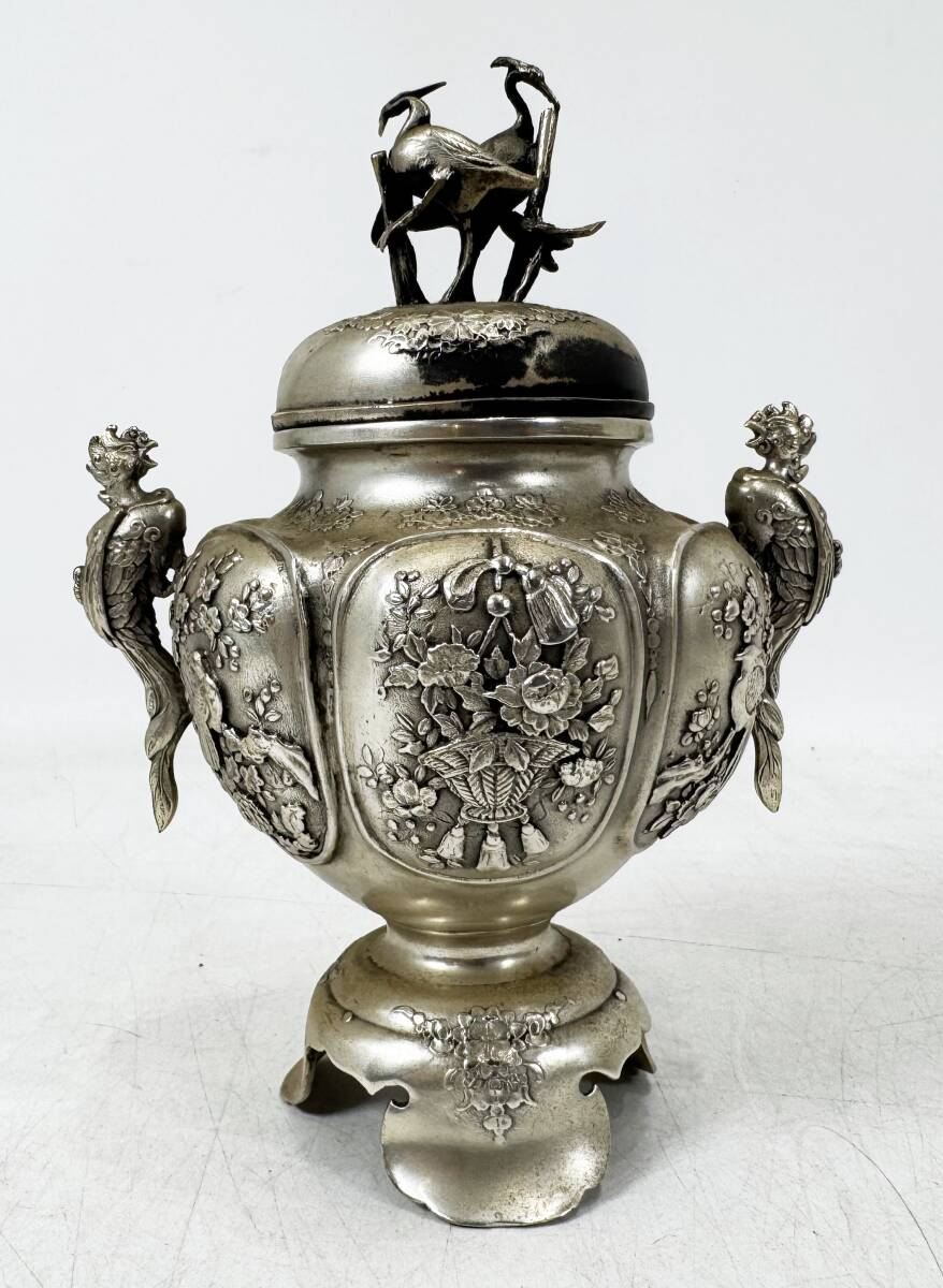 - 稀少 香炉 銀製品 精密彫 双鶴花鳥三足香炉 骨董 古美術 茶道具 古道具 煎茶道具 香道 時代物