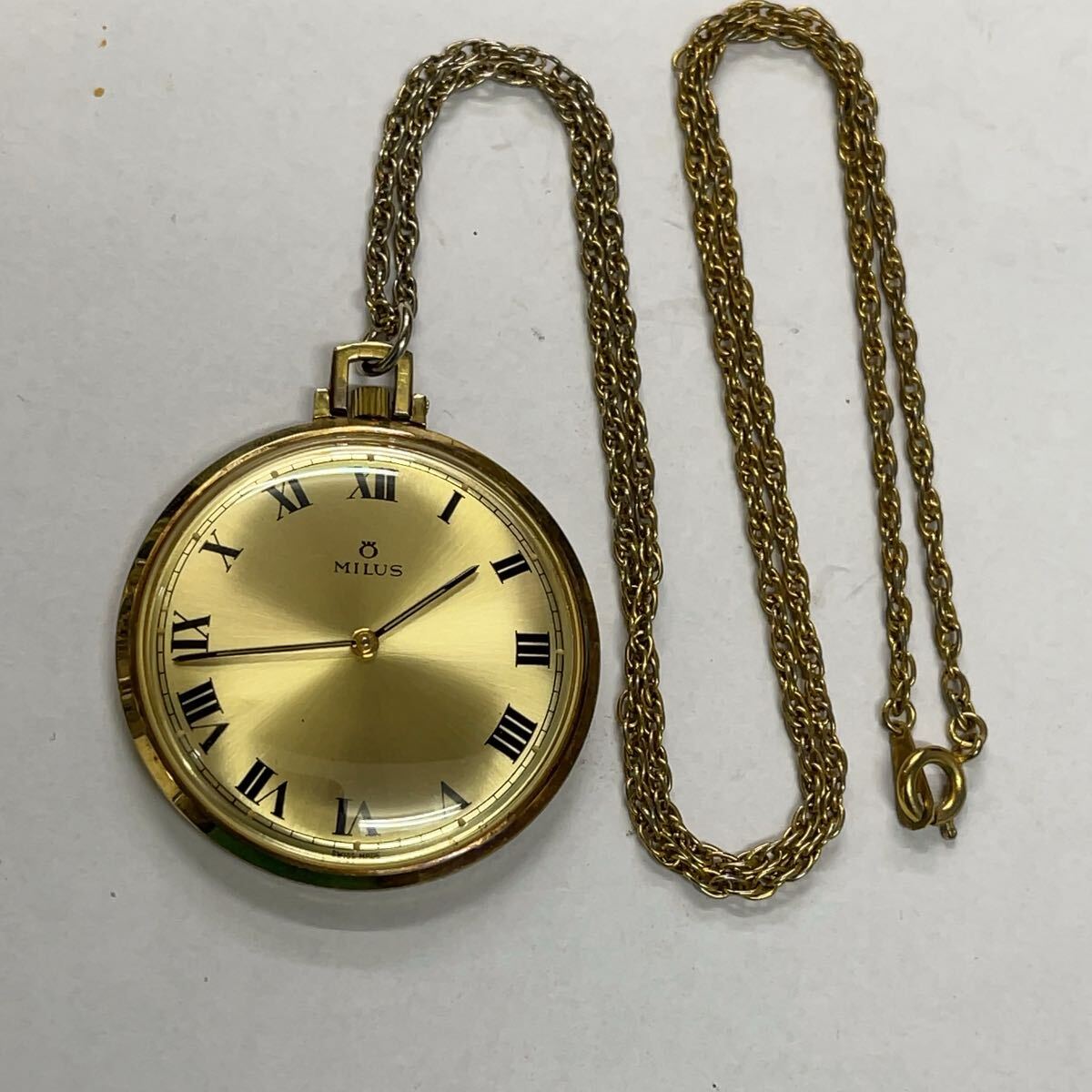 - アンティーク MILUS ミリス 手巻き 懐中時計 ポケットウォッチ ゴールドカラー チェーン付き 稼働品