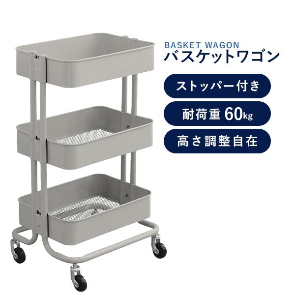 > バスケットワゴン キッチンワゴン キャスター付き 3段 耐荷重60kg 高さ調節 ツールワゴン 多肉棚 メッシュ スチールラック 小物収納 グレー