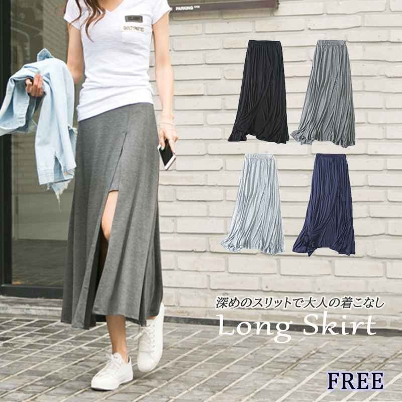 - スリット可愛い スカート ロング Aライン ウエストゴム 見せパン 大人 楽ちん 体形カバー フリー ライトグレー
