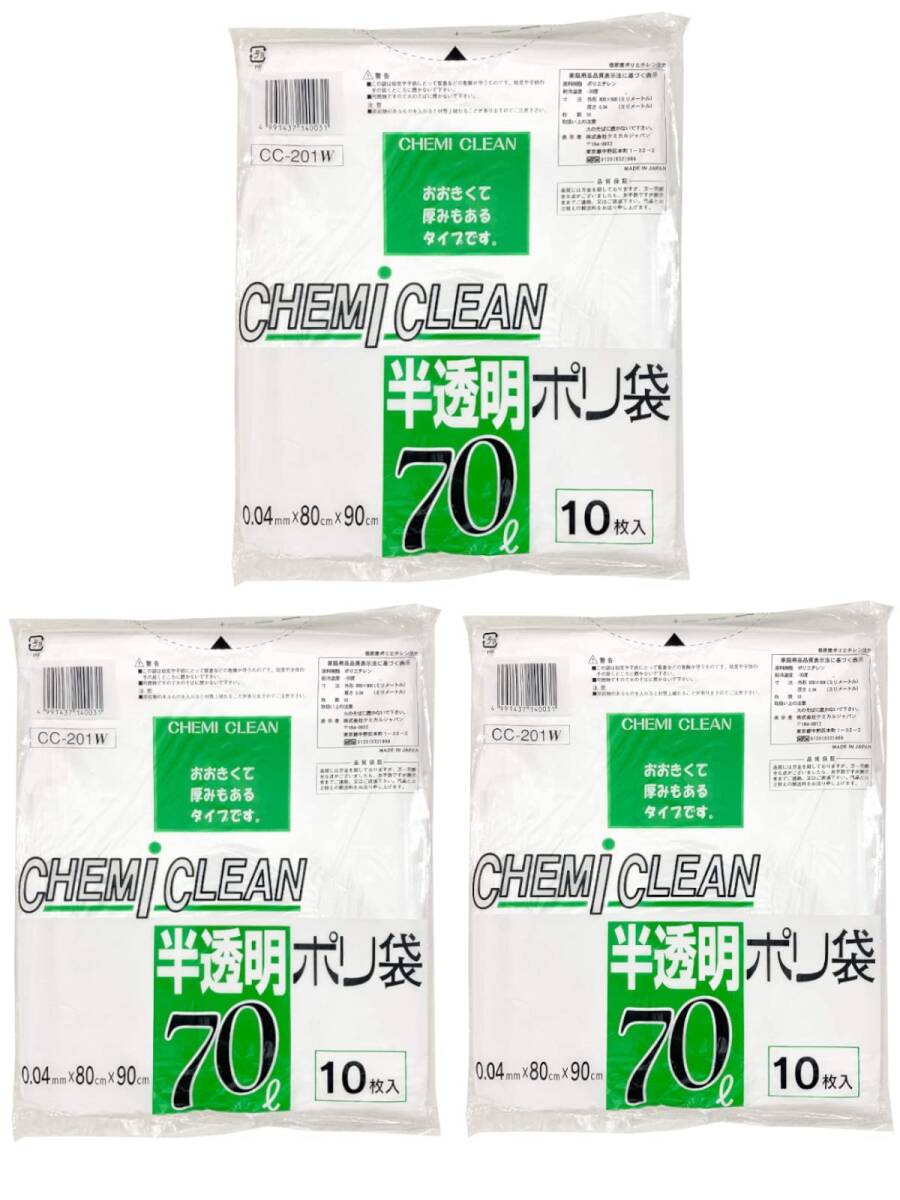 > ケミカルジャパン ゴミ袋 厚くて丈夫 ポリ袋 CC-201W 70L 半透明 30枚 (10枚×3セット) 幅80×高さ90cm 厚み0.04m