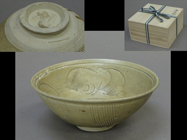 - 【心庵】中国美術 青磁陰刻花文/茶碗 付箱 SI154