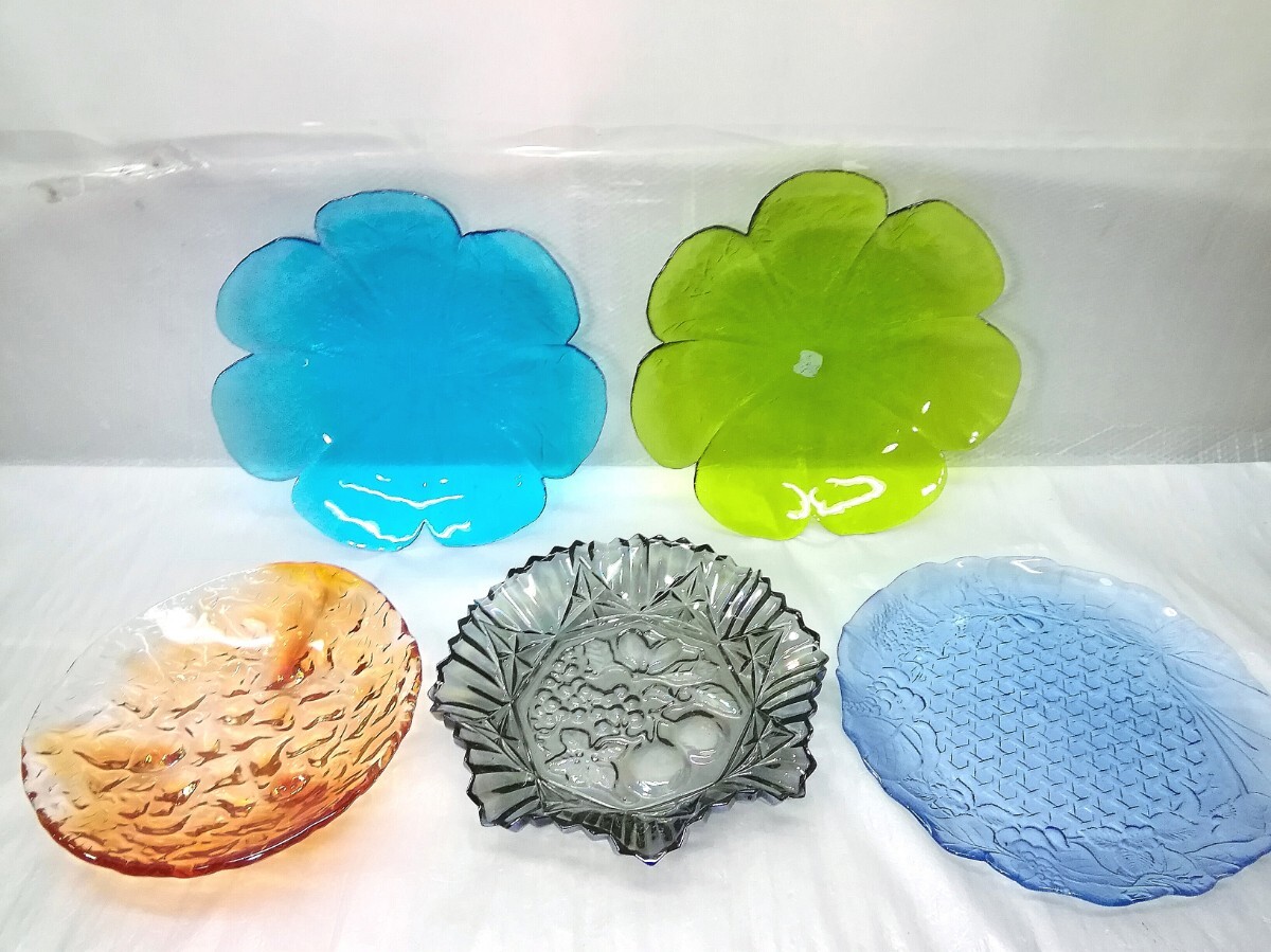 - カラーガラス 食器 大皿 まとめて5点 色付き食器 花びら 脚付き 変形皿 カラフル ガラス皿 プレート ガラス食器 (CF)