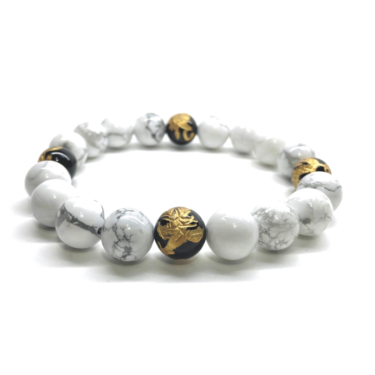 - 10mm 四神獣金彫オニキス×ハウライト パワーストーン ブレスレット天然石 運気上昇 開運 金運 恋愛運 青龍 白虎 玄武 朱雀 ☆