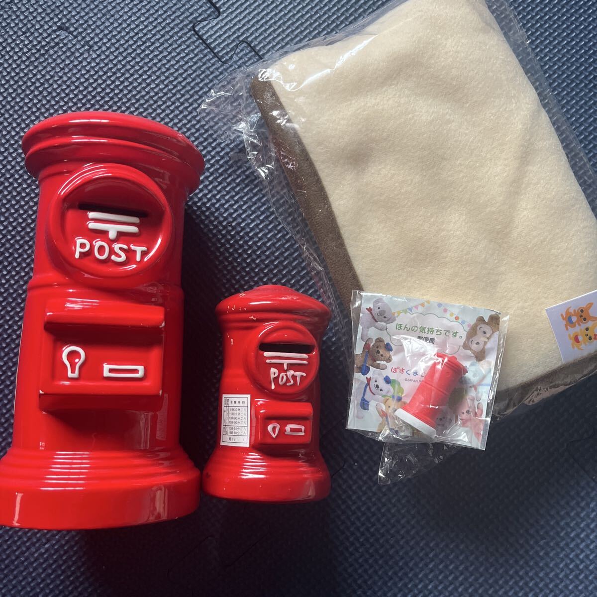 - 非売品 ノベルティ◇ 郵便ポスト 貯金箱 郵便局 ポスト型 消しゴム フリースブランケット かんぽ生命 4点セット