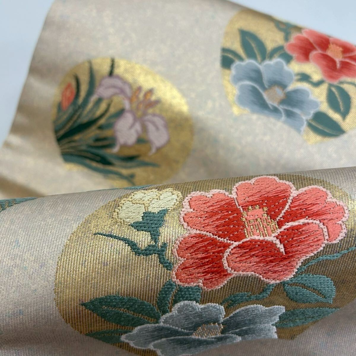 - 名古屋帯 引き箔 金彩 唐織の花模様 九寸 正絹 着物 W-4815