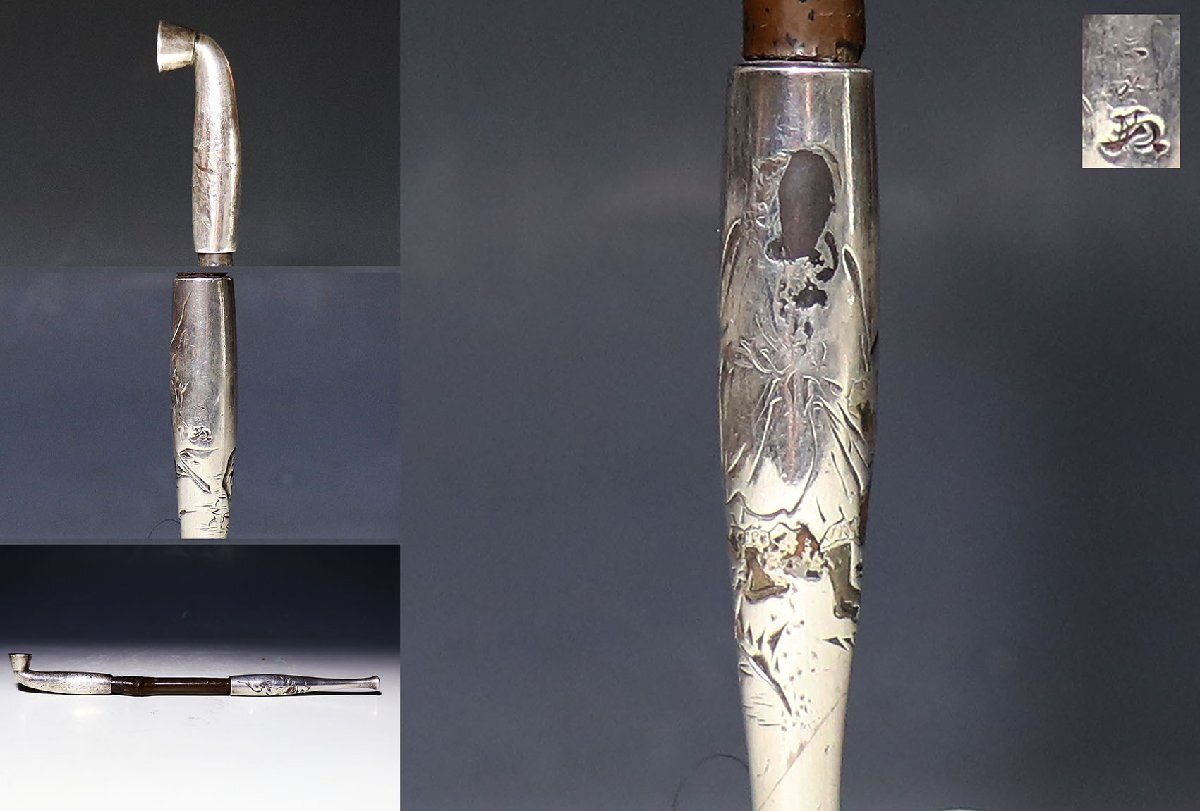 - 【桃】提げ物:金工純銀人物図煙管 純銀刻印 在銘