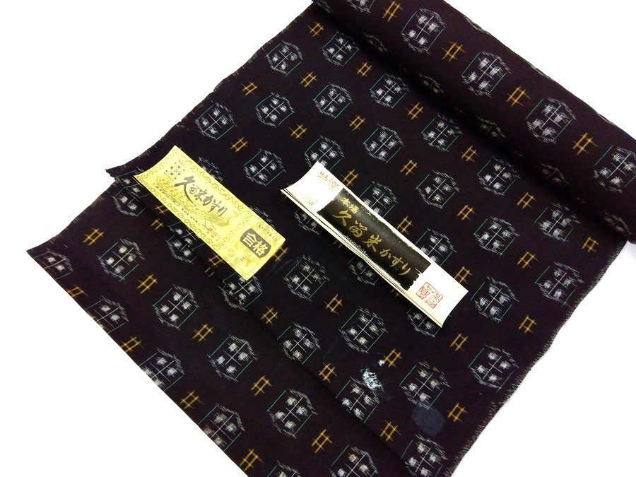 - 綿紬 反物 久留米絣 綿100% 焦茶に黄色の井桁 赤墨色 新品 193