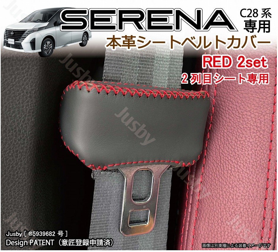 - 新型セレナ C28用 本革シートベルトカバー (2列目用) (赤ステッチ) SERENA 本皮レザーカバー パーツ アクセサリー NISSAN 異音防止 傷防止