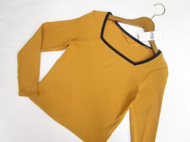 - 新品タグ付 ジーユー GU 長袖 スクエアネック ニットバイカラースクエアネックコンパクトTシャツ M オレンジ