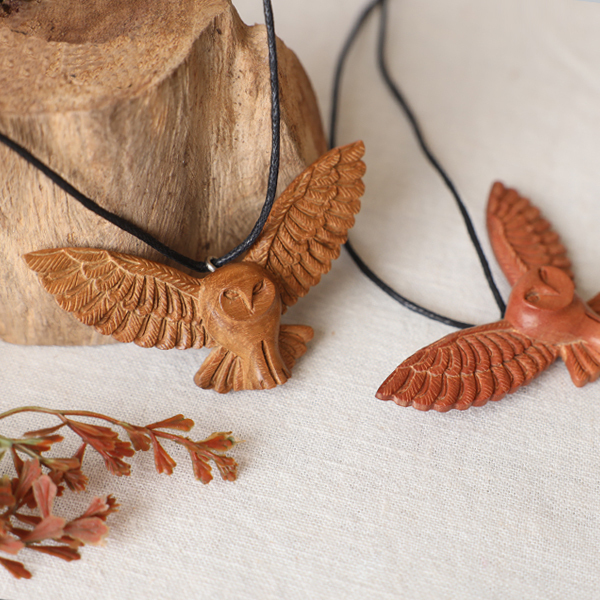 - 新作 ネックレス 手彫り ウッド カービング 天然木 フクロウ モチーフ ペンダントトップ チークウッド Q17B