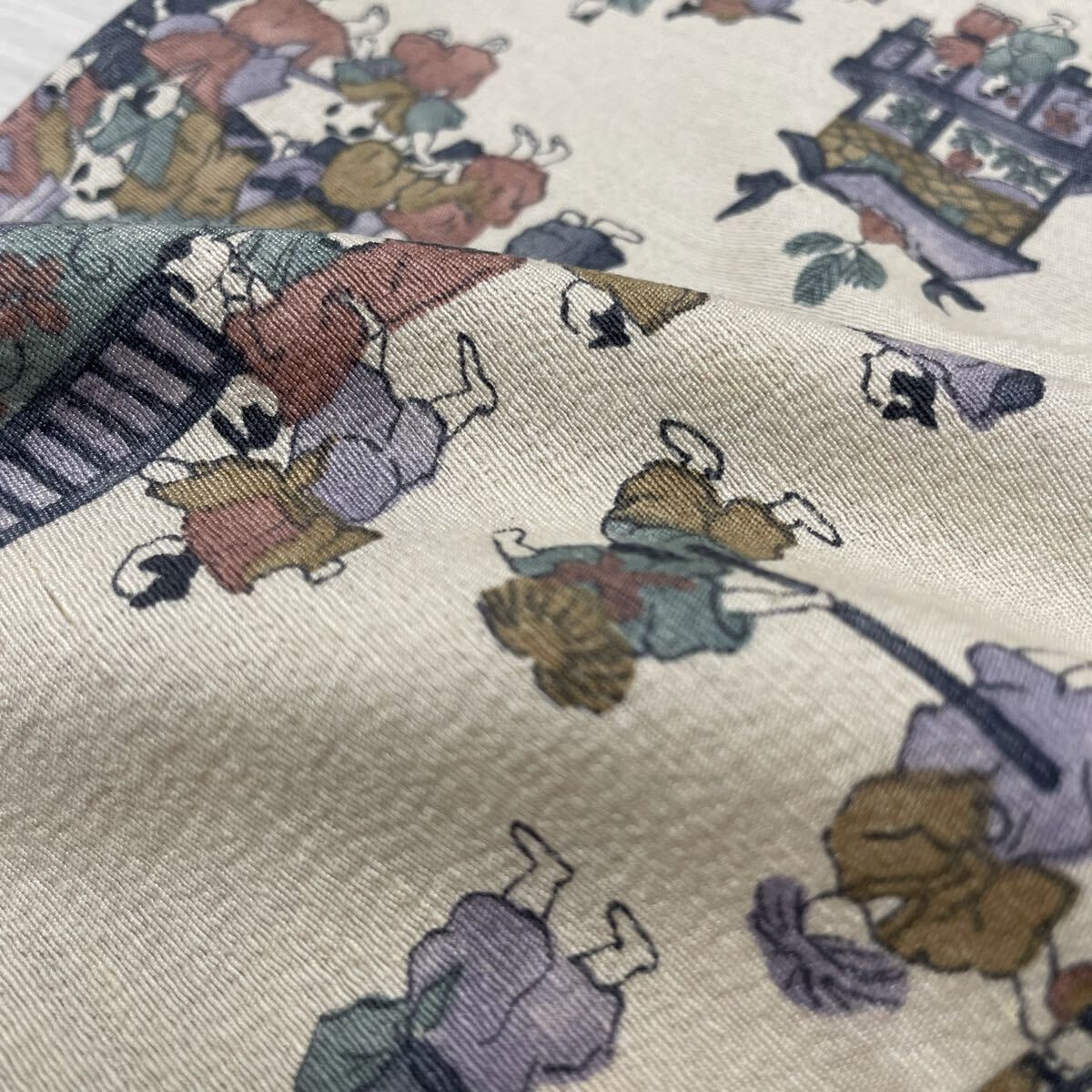 - 小紋 ちりめん やぐら 昔風景 着物 正絹 W-4921