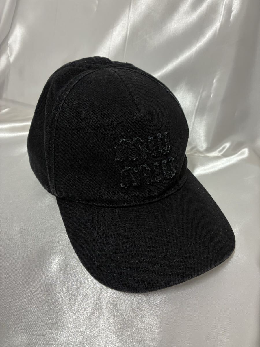 > 「S791」ミュウミュウ miumiu ブラック デニム ヴィンテージ ユーズド加工 キャップ 帽子 Lサイズ 黒