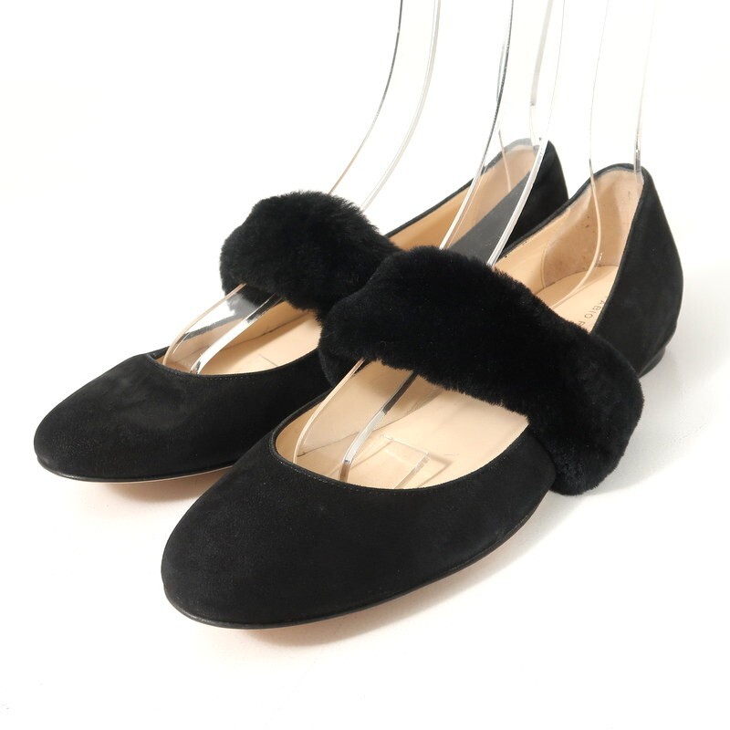 > MH9291*イタリア製 ファビオルスコーニ FABIO RUSCONI ボアストラップ パンプス フラットシューズ スエードレザー 38(24cm相当) ブラック