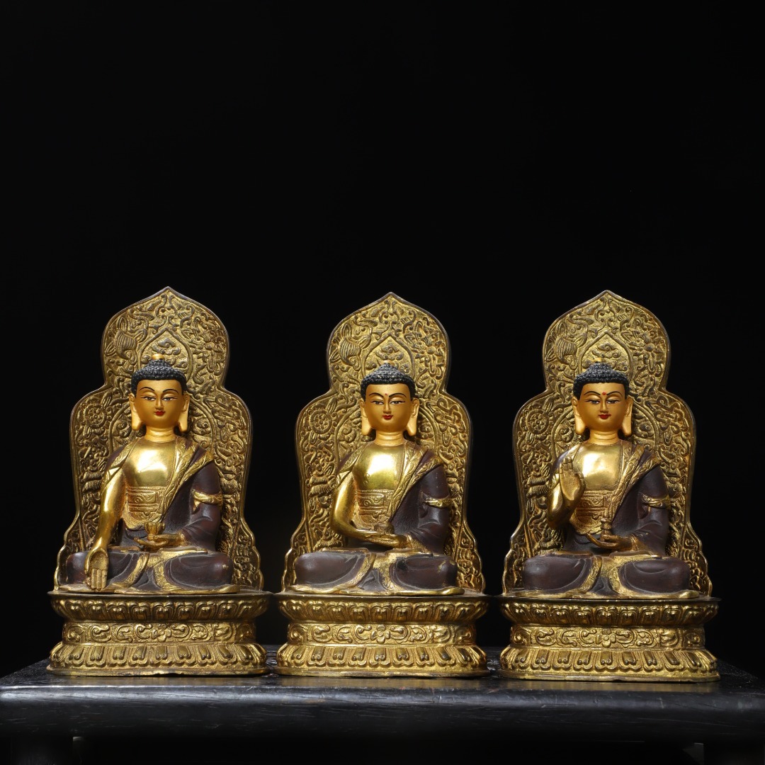 > ◆珍蔵◆中国古美術 明時代 古銅製 銅塗金 靠背 三宝仏 3点 仏造像 細密細工造 置物 擺件 古賞物 骨董品 時代物 A01