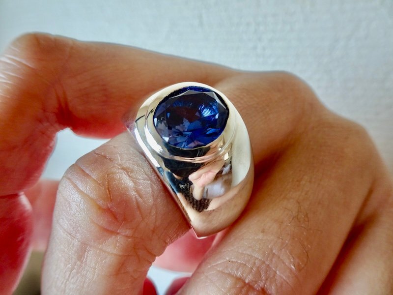 - 仁尾彫金『オーバルカット合成ブルーサファイア覆輪プラチナ、リング』ハンドメイド372b