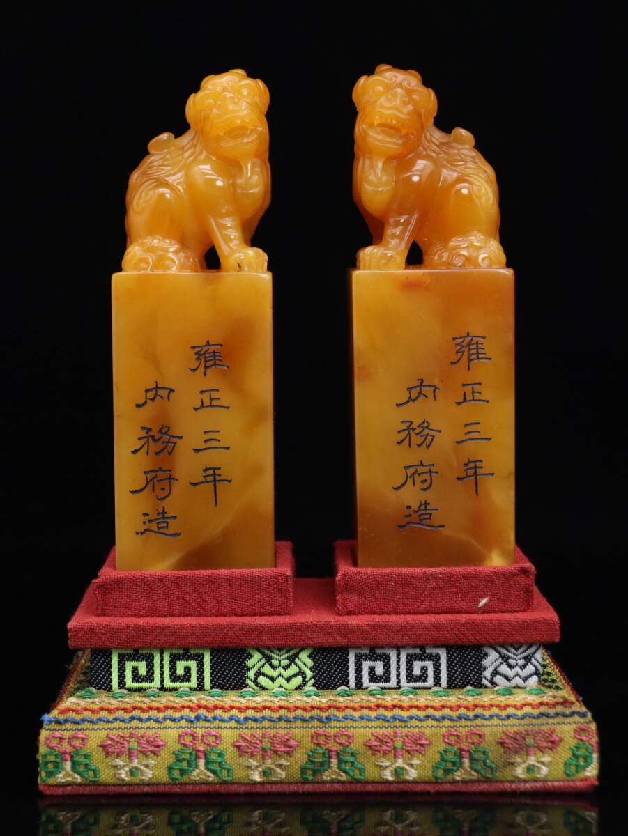 > 中国古美術 清時代 雍正三年 古寿山石 田黄石彫り古獸 印章 精品―對 箱付 細密細工造 置物 擺件 古賞物 骨董品 時代物 A17