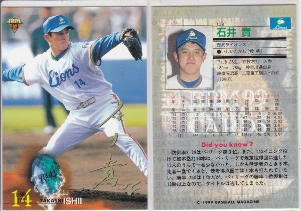 - ●1999BBM 【石井 貴】 金色サインパラレル No.158:西武 R2