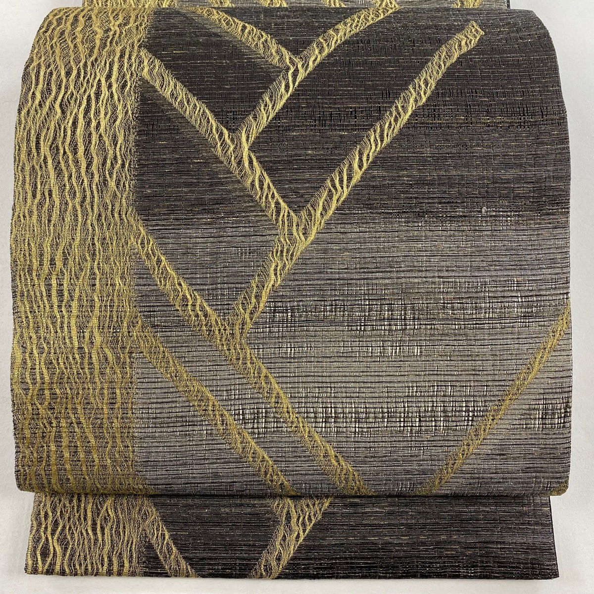 - 【美品】 袋帯 秀品 落款 大島紬美術館 幾何学模様 段縞 金糸 箔 黒灰 全通 正絹 【中古】