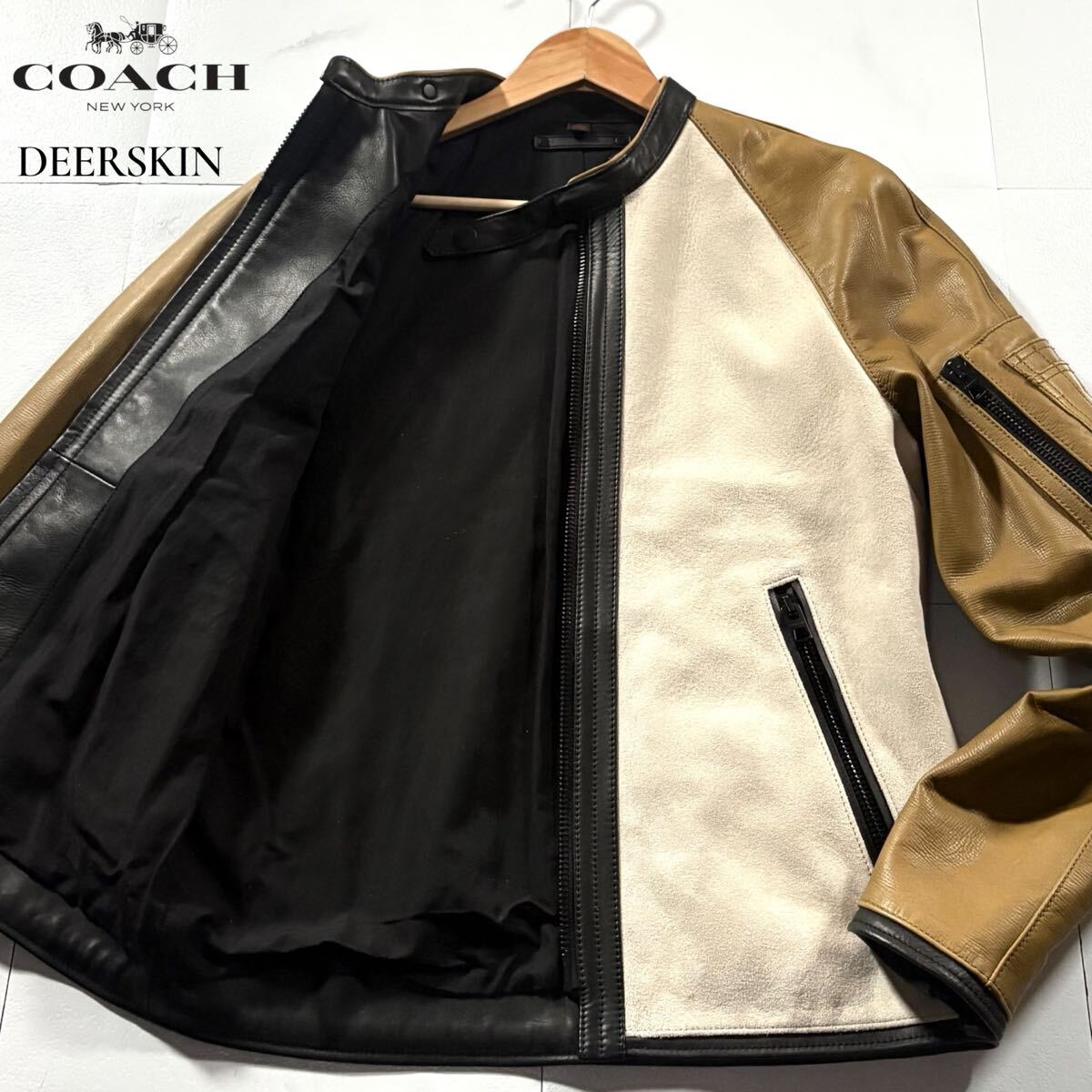 > 超希少/鹿革!!●最高級 COACH コーチ ディアスキン レザー ライダース ジャケット 牛革切替 カラーレス ダブルジップ スエード Mサイズ