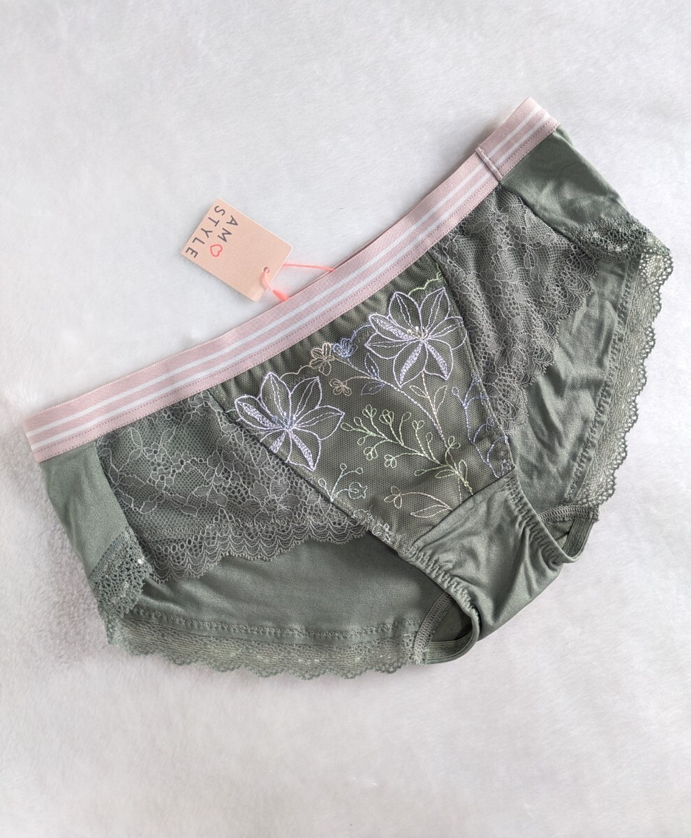 - お泊まりに☆パンティ未使用M☆可愛いお花刺繍レース☆モスグリーン☆トリンプ☆AMOSTYLE☆匿名配送可☆
